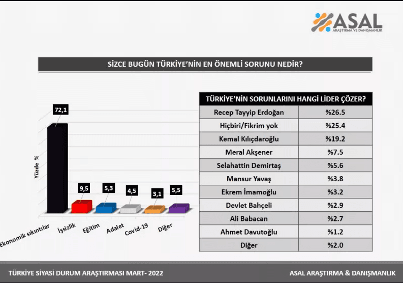 ASAL Araştırma Şirketinin 15-18 Mart 2022 tarihleri arasında 28 ilde bin 580 kişiyle yaptığı son ankette katılımcılara, "Türkiye'nin en büyük sorunu nedir?" sorusu yöneltildiği ve yüzde 72.1'inin hayat pahalılığı ve ekonomik sorunlardan yakındığı, yüzde 9.5'inin "İşsizlik", yüzde 5.3'ünün "Eğitim", yüzde 4.5'inin "Adalet", yüzde 3.1'inin "Kovid-19" yanıtı verdiği kaydedildi.