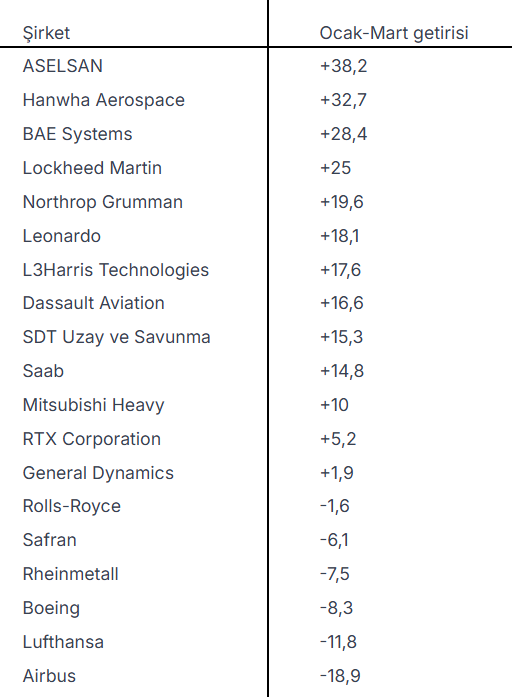 Dünyanın önde gelen savunma ve havacılık şirketleri ile Borsa İstanbul'da işlem gören savunma sanayisi şirketlerinin hisselerinin ocak - mart getirileri (yüzde) şöyle: