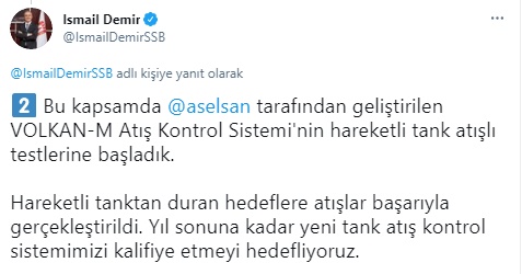 Demir, Twitter hesabından yaptığı açıklamada, "Türk Silahlı Kuvvetleri envanterindeki M60TM tanklarımızın bir yandan modernizasyonunu bir yandan tüm bileşenlerinin millileştirilmesini sağlıyoruz. Böylece dışa bağımlılığı azaltırken, tanklarımızı yüksek performanslı güncel sistemlerle donatıyor ve ömür devri sürelerini uzatıyoruz. Bu kapsamda ASELSAN tarafından geliştirilen VOLKAN-M Atış Kontrol Sistemi'nin hareketli tank atışlı testlerine başladık. Hareketli tanktan duran hedeflere atışlar başarıyla gerçekleştirildi. Yıl sonuna kadar yeni tank atış kontrol sistemimizi kalifiye etmeyi hedefliyoruz" ifadesini kullandı.