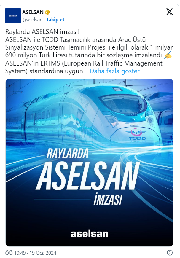 ASELSAN'ın Kamuyu Aydınlatma Platformu'nda (KAP) yer alan açıklamasına göre, şirket ile TCDD Taşımacılık AŞ arasında Araç Üstü Sinyalizasyon Ekipmanı Temini Projesi ile ilgili olarak toplam değeri 1 milyar 690 milyon 697 bin lira tutarında yeni bir sözleşme imzalandı.