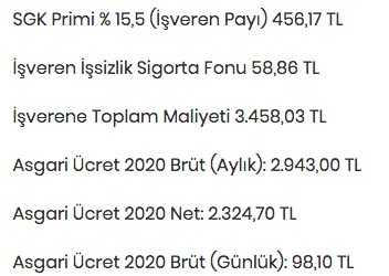 Brüt asgari ücret 2020 yılı için geçerli olmak üzere 2 bin 943 TL olarak yine Asgari Ücret Tespit Komisyonunca kabul edilmiştir. İşçinin cebine giren asgari ücret ne kadar? İşçinin cebine giren brüt asgari ücretten belirli kesintiler yapılarak asgari ücret net hesaplaması yapılmakta. Dolayısıyla işçinin cebine kesintiler ((SGK primi, damga vergisi, gelir vergisi vb.) düşüldükten sonra net asgari ücret girmektedir. Asgari ücretin işverene maliyeti ne kadar? Asgari ücretin işverene maaliyeti brüt ücretin üzerinde belirlenmekte.