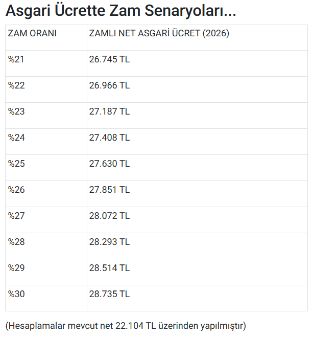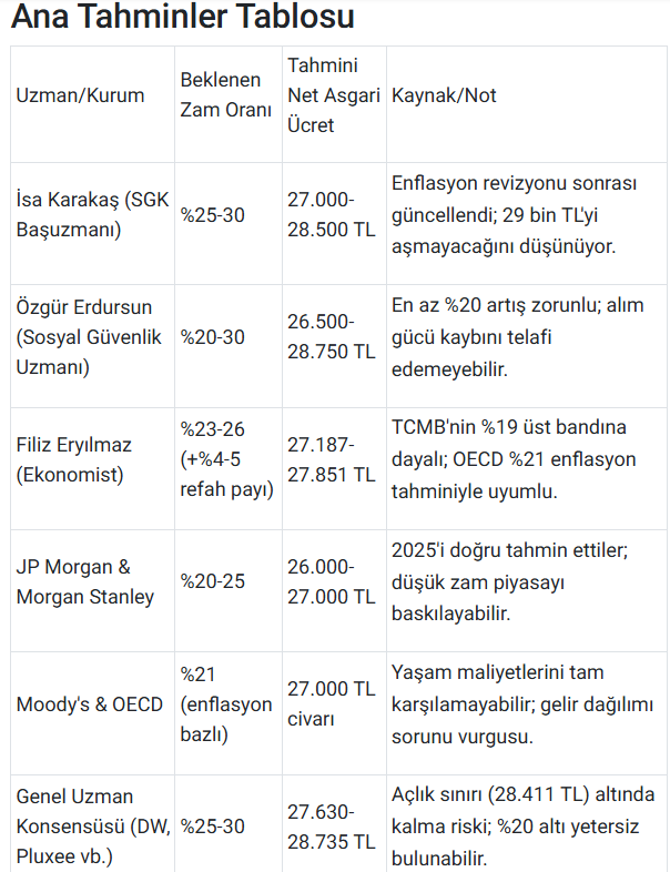 SGK Başuzmanı İsa Karakaş, asgari ücrete yüzde 25 ila yüzde 30 arasında zam konuşulduğunu ifade etmişti. Zam beklentisini paylaşan Karakaş, "Benim beklentime uygun olarak asgari ücretin 27-28 bin TL bandına geleceğini, 29 bin TL'yi bulmayacağını söyleyebiliriz. Tam yüzde 30 zam yapılırsa 2026 yılı asgari ücreti 28 bin 700 TL civarında olur. Ama bence 28 bin 500 gibi bir rakam olacak. 29 bini bulmayacağını söyleyebiliriz" dedi.