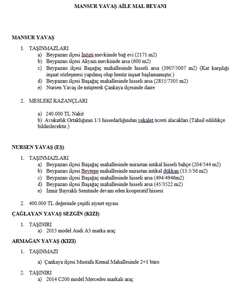 Mansur Yavaş'ın kendi yayınladığı mal varlığı beyanatını aşağıda yayınlıyor. Yavaş, bütün bu mal varlığını sadece 470 lira ödemiş.