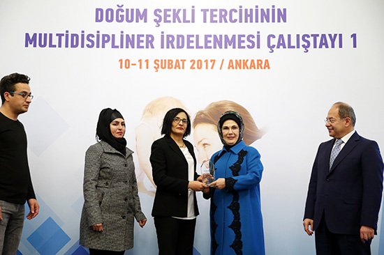 Emine Erdoğan, yıllık doğum sayısı 4 bin 500 üzeri olan hastanelerden, sezaryen oranı en düşük 9 devlet hastanesinin doğumhane klinik şefi ebelerine ve gebe okulu sorumlularına üstün hizmet plaketi verdi.