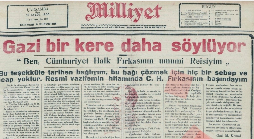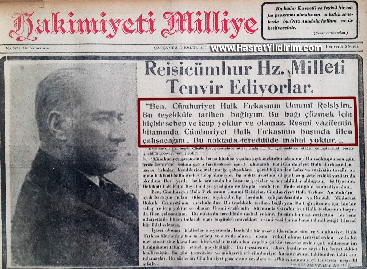 M.Kemal’in Cumhurbaşkanı vasfıyla yaptığı açıklama, Eylül 1930 tarihli Hakimiyeti Milliye gazetesinde de yayınlandı. CHP’den aktarılan paralarla yayın yapan Hakimiyeti Milliye’nin “Reisicumhur Hazretleri milleti tenvir (aydınlatma) ediyorlar” başlığıyla yayınladığı haberde, “Bu teşekküle tarihen bağlıyım, bu bağı çözmek için hiçbir sebep ve icap yoktur. Resmi vazifemin hitamında (bitiminde) C.H.Partisi’nin başında fiilen çalışacağım. Bu noktada tereddüde mahal yoktur” sözleri yer alıyor.