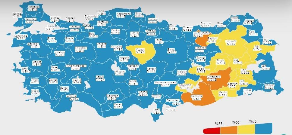 Yüzde 65 ile yüzde 74 arasındaki sarı iller şöyle: Yozgat, Bayburt, Erzurum, Ağrı, Muş, Bingöl, Elazığ, Adıyaman, Mardin, Batman, Siirt