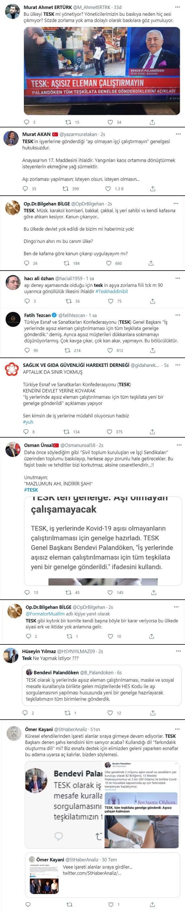 Açıklamanın ardından TESK Başkanı Bendevi Palandöken'e vatandaşlardan sert tepki geldi. "Ülkeyi TESK mi yönetiyor?" diye soran vatandaşlar, "TESK'in genelgesi hukuksuzdur", "Herkes kafasına göre kanun çıkarıp uyguluyor, Dingo'nun ahırı mı burası?", "TESK Başkanı, insan hakları ihlali yaparak Anayasa suçu işliyor", "TESK başkanı denilen şahıs kendisini kim sanıyor? Kullanılan bu dil farkındalık oluşturma dili mi?", "Bu bölücülüktür" gibi tepkilerde bulundu.