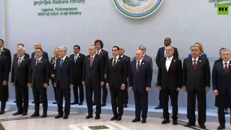 Türkmenistan’daki Barış ve Güven Formunda liderler fotoğrafı. Ev sahibi Berdimuhamedov, sağ yanına Erdoğan’ı sol yanına ise Putin alıyor. Rus basını haberi “Erdoğan, Putin ve dünya liderleri fotoğraf çektirdi” şeklinde geçti.