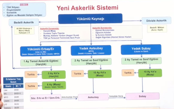 "Sistemde en önemli husus şunlar; Bir, yükümlü kaynağımız var. Bu yükümlü kaynağı geldiğinde her sene takriben 700 bin gencimiz askerlik yaşına geliyor. Dağılımı şöyle olacak, bir bedelli askerlik, iki yükümlü erbaş ve erler, üç yedek astsubay, daha sonra da yedek subaylık. Ve beşinci parça da dövizli askerlik. Bunlar sürekli olacak. Bunların kurallarını, ilkelerini belirledik ve belirleyeceğiz. Bütün zamanlarda bu düzenleme devam edecek. Bir gencimiz diyelim ki lise mezunu. Bir ay temel askerlik yapacak, bedelliye ayrılanlarla beraber. Kurayla da ihtiyaçtan fazla bedelli yapmak isteyen olursa mecburen kura çekilecek. Belirlenen erbaş ve erler, hem bedelliler bir ay eğitim yapacaklar. Bir ay temel eğitime müteakip diğer lise mezunu ve altı olan gençlerimiz 5 ay daha kıtalarda görev yapacak; toplam 6 ay. Bu 6 ay bittikten sonra erlere soracağız, kalmak ister misiniz? Bir bir ay ve 5 ayda sadece harçlık alacaklar. 6 ay bittikten sonra istekli oldukları takdirde sınav veya yeteneklere sahip oldukları takdirde 6 aylık sözleşme yapılacak. Maaşlı süre 6 ay bittikten sonra yine komutanları orada değerlendirmelerde, bu genç başarılı olduğu takdirde sözleşmeli er / uzman erbaş olabilecek."
