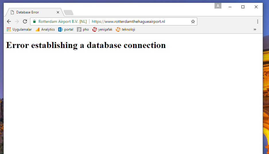 Rotterdam Havayolları'nın resmi sitesine girilmek istendiğinde aşağıdaki hata ile karşılaşılıyor.