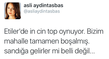Aslı Aydıntaşbaş Etiler'de yaptığı gözlemi twitter'dan duyurdu. Buna göre Etiler'de 'in cin top oynuyor' yani CHP ve HDP'ye az oy çıkacak..