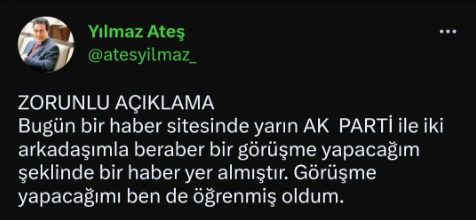 Aslı Baykal ile birlikte AK Parti ile görüşeceği iddia edilen isimlerden Yılmaz Ateş, kişisel Twitter hesabından "Bugün bir haber sitesinde yarın AK PARTİ ile iki arkadaşımla beraber bir görüşme yapacağım şeklinde bir haber yer almıştır. Görüşme yapacağımı ben de öğrenmiş oldum" paylaşımı yaptı.