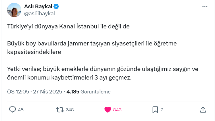 "Türkiye'yi dünyaya Kanal İstanbul ile değil de büyük boy bavullarda jammer taşıyan siyasetçileri ile öğretme kapasitesindekilere yetki verilse; büyük emeklerle dünyanın gözünde ulaştığımız saygın ve önemli konumu kaybettirmeleri 3 ayı geçmez."
