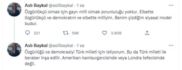 Kılıçdaroğlu'nun ABD ve İngiltere'ye düzenlediği seyahatlerine göndermede bulunan Aslı Baykal, ''Özgürlükçü olmak için gayrı milli olmak zorunluluğu yoktur. Elbette özgürlükçü ve demokratım ve elbette milliyim. Benim çizdiğim siyasal model budur. Özgürlüğü ve demokrasiyi Türk milleti için istiyorum. Bu da Türk milleti ile beraber inşa edilir. Amerikan hamburgercisinde veya Londra tefecisinde değil.'' ifadelerini kullandı.