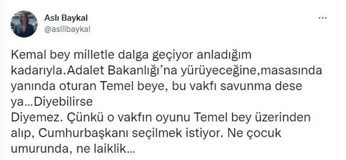 CHP'den istifa eden ve son dönemlerde CHP'ye karşı aldığı tavırlarla gündeme gelen Aslı Baykal, CHP Lideri Kemal Kılıçdaroğlu'nun Adalet Bakanlığı'na yürümesine tepki gösterdi. Aslı Baykal, "Kemal Bey milletle dalga geçiyor anladığım kadarıyla. Adalet Bakanlığı'na yürüyeceğine, masasında yanında oturan Temel Bey'e, 'bu vakfı savunma dese' ya" dedi.