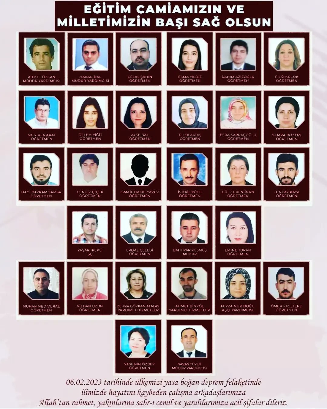 Kahramanmaraş merkezli 7.7 ve 7.6 şiddetindeki asrın felaketinde hayatını kaybeden öğretmenlerimiz rahmetle yad ediliyor.