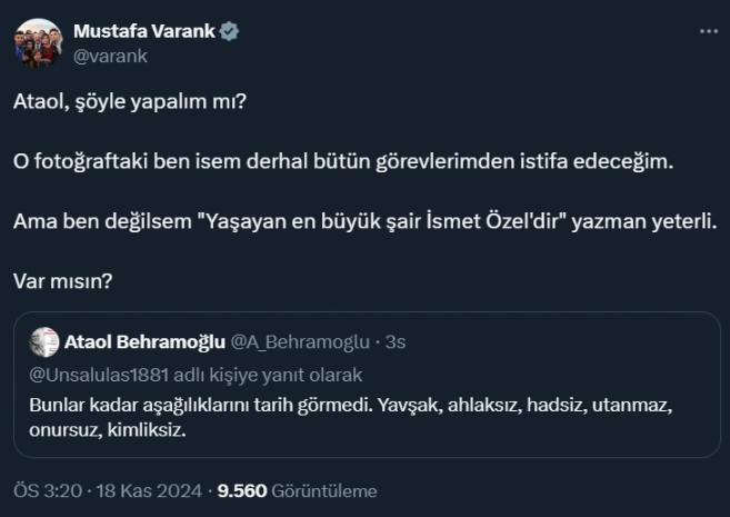 O fotoğraftaki ben isem derhal bütün görevlerimden istifa edeceğim. Ama ben değilsem “Yaşayan en büyük şair İsmet Özel'dir” demen yeterli. Var mısın?