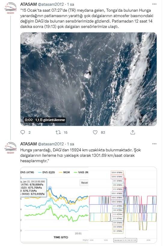 Atatürk Üniversitesi Astrofizik Araştırma ve Uygulama Merkezi (ATASAM), 15 Ocak'ta Türkiye saati ile 07:27’de Tonga'da bulunan Hunga yanardağında meydana gelen patlamanın neden olduğuı şok dalgalarının, Doğu Anadolu Gözlemevi’nin (DAG) sensörlerine yansıyan verilerini sosyal medya hesabından paylaştı. DAG sensörlerine yansıyan verilere ilişkin yapılan değerlendirmede, “15 Ocak'ta saat 07:27'de (TR) meydana gelen, Tonga'da bulunan Hunga yanardağının patlamasının yarattığı şok dalgalarının atmosfer basıncındaki değişim DAG'da bulunan sensörlerimizde gözlendi. Patlamadan 12 saat 14 dakika sonra (19:13) şok dalgaları sensörlerimize ulaştı. Hunga yanardağı, DAG'dan 15 bin 924 km uzaklıkta bulunmaktadır. Şok dalgalarının ilerleme hızı yaklaşık olarak 1301.69 km/saat olarak hesaplanmıştır” ifadeleri kullanıldı.