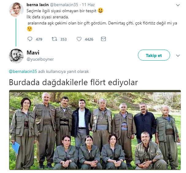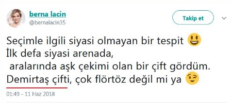 Berna Laçin yaptığı paylaşımda, "Seçimle ilgili siyasi olmayan bir tespit. İlk defa siyasi arenada, aralarında aşk çekimi olan bir çift gördüm. Demirtaş çifti, çok flörtöz değil mi ya" sözleriyle Kandil'in partisi HDP'nin cumhurbaşkanı adayı Selahattin Demirtaş'ı sevimli gösterdi.