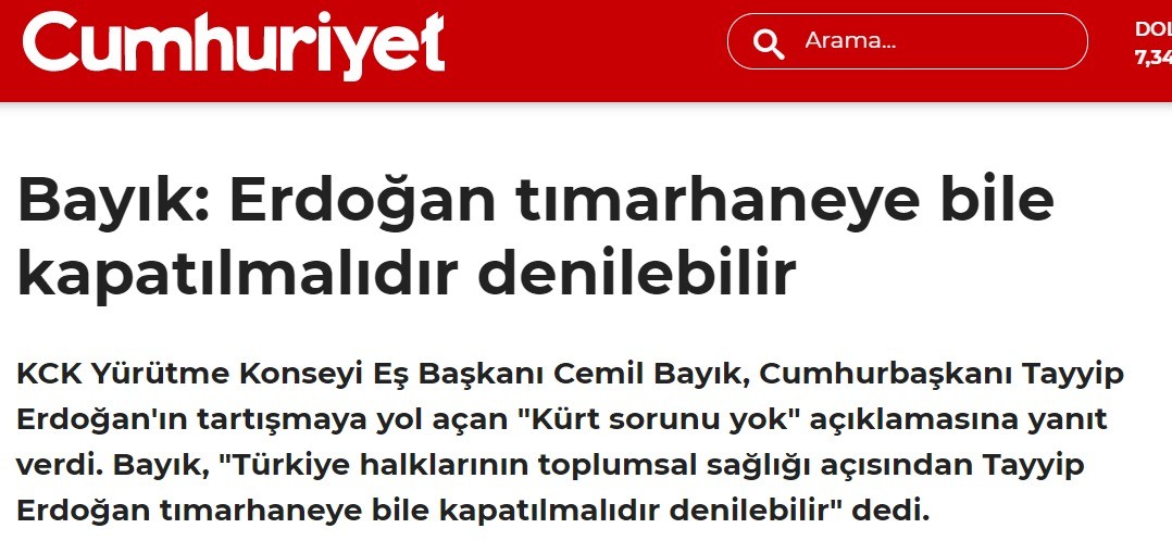 PKK'nın sözde üst düzey yöneticilerinden Cemil Bayık'ın sözlerini haberleştiren Atatürkçü Cumhuriyet, bir teröristin ağzından Cumhurbaşkanı Erdoğan'a hakaretleri haberleştirirken, teröristi şu ifade ile sunuyor: 'KCK Yürütme Konseyi Eş Başkanı Cemil Bayık'