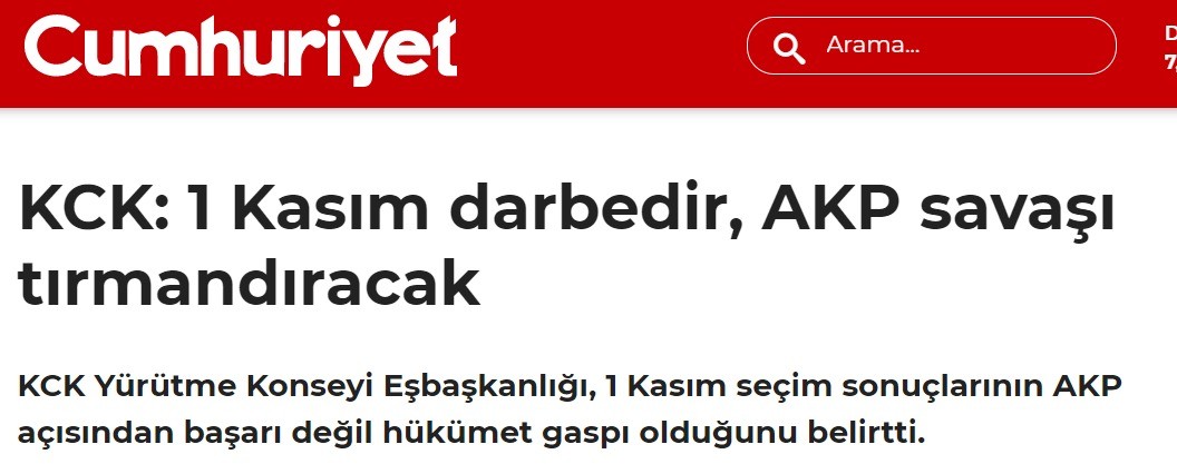 Cumhuriyet, 1 Kasım seçimlerinde halkın iradesine başkaldıran KCK adlı terörist oluşumun açıklamasını manşetinden şöyle veriyor: 'KCK: 1 Kasım darbedir, AKP savaşı tırmandıracak'