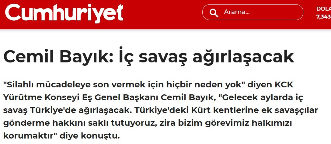 Yine terörist Cemil Bayık'a terörist demeyen Atatürkçü Cumhuriyet, Bayık'ın alçak ifadelerini şu şekilde duyuruyor: 'Cemil Bayık: İç savaş ağırlaşacak'