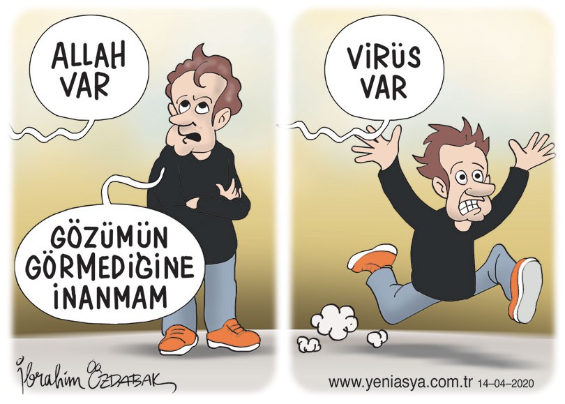 İbrahim Özdabak imzalı karikatürde Allah'a inanmayan kesimin "Gözümün görmediğine inanmam" bahanesine yer verilirken, virüsü görmeyen aynı kesimin yaygara koparması resmedildi.