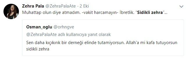 Zehra Pala'nın verdiği yanıtta 'muhatap' kelimesini 'muhattap' olarak yazması ise Allah'a karşı cehaletlerinden başka silahı olmayan ateistlerin seviyesini gözler önüne serdi.