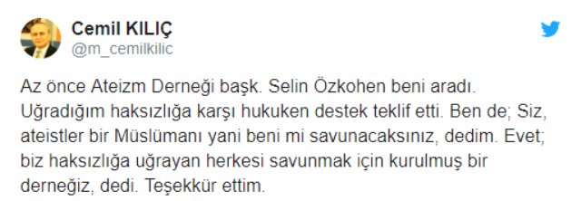 Kılıç, sosyal medya hesabından yaptığı paylaşımda "Az önce Ateizm Derneği Başkanı Selin Özkohen beni aradı. Uğradığım haksızlığa karşı hukuken destek teklif etti. Ben de; Siz, ateistler bir Müslümanı yani beni mi savunacaksınız, dedim. Evet; biz haksızlığa uğrayan herkesi savunmak için kurulmuş bir derneğiz, dedi. Teşekkür ettim." diye yazdı.,