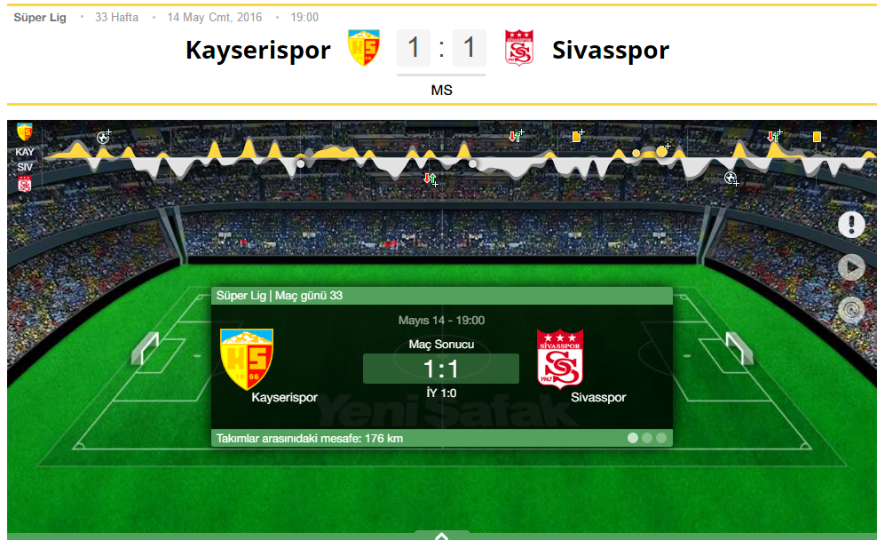 Kayserispor ile Sivasspor arasında oynanan karşılaşma Biseswar ve Chahechouhe'nun attığı karşılıklı gollerle 1-1 sona erdi. Sarı kırmızılılar bu sonuçla beraber ligde kalmayı garantiledi.