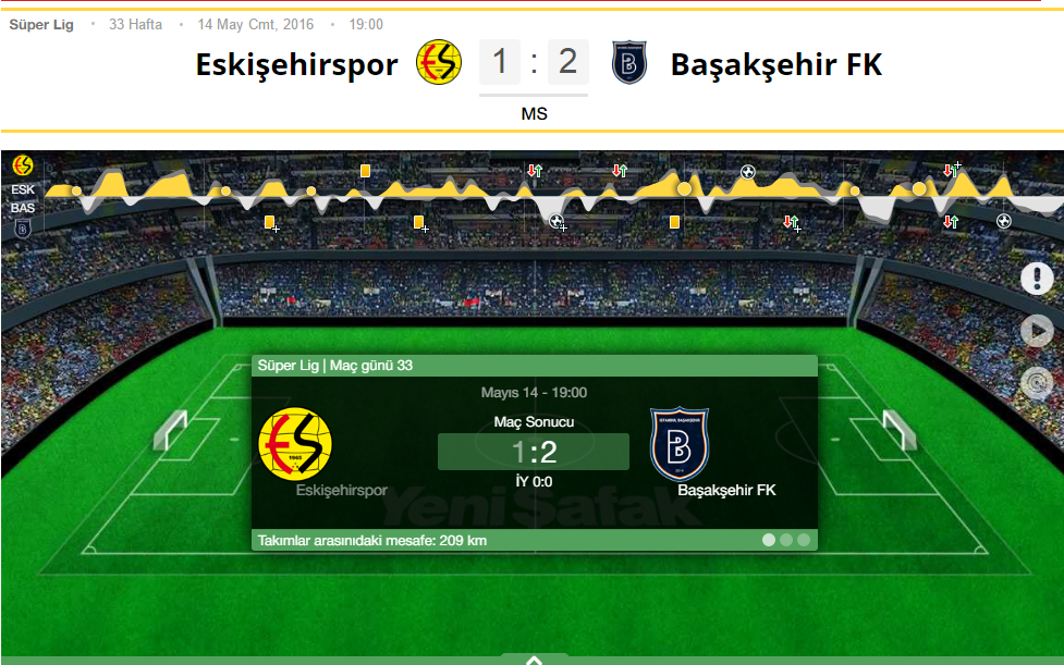 Süper Lig'in 33.haftasında Eskişehirspor, Medipol Başakşehir karşısında son dakikalarda yediği golle 2-1 mağlup oldu. Bu sonucun ardından Medipol Başakşehir, ligi 4.sırada bitirmeyi garantiledi. Eskişehirspor ise ligde kalma şansını mucizelere bıraktı.