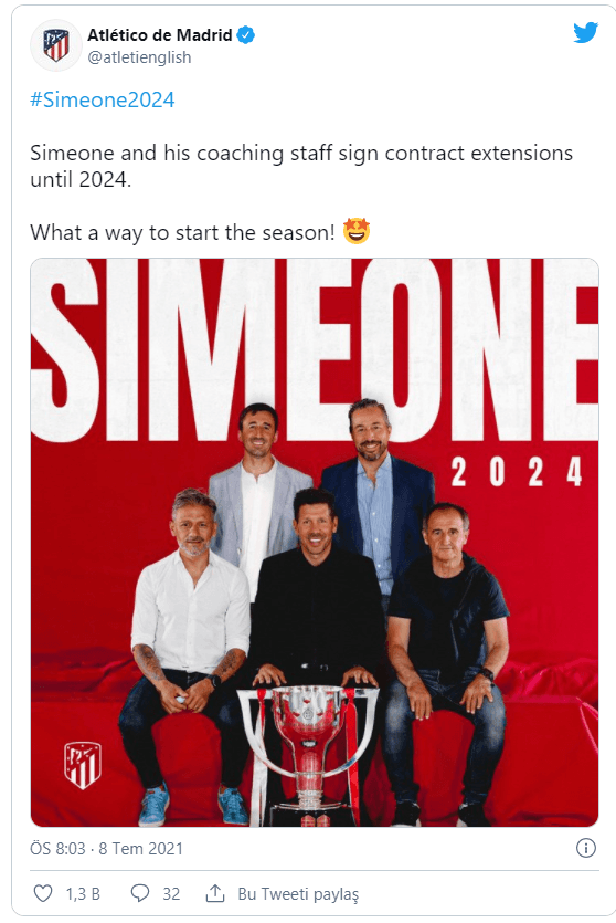 İspanya Birinci Futbol Ligi'nin (La Liga) son şampiyonu Atletico Madrid, teknik direktör Diego Simeone ile yola devam etme kararı aldı.