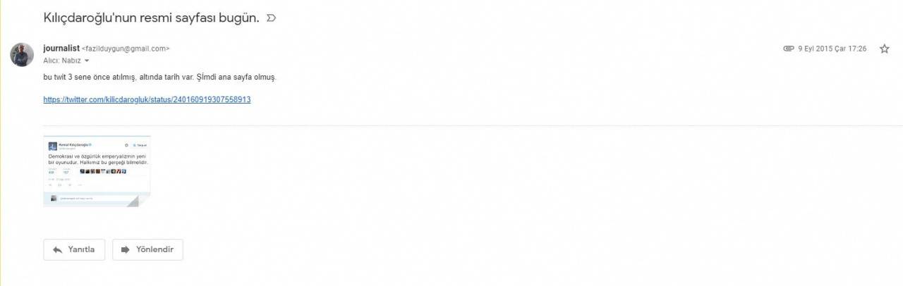 Aynı tweeti Kılıçdaroğlu'nun 3 yıl sonra sildiğini öğrenen yazar Uğur, bu gelişmeleri, gazeteci Fazıl Duygu'nun kendisine gönderdiği e-maille öğrendi.