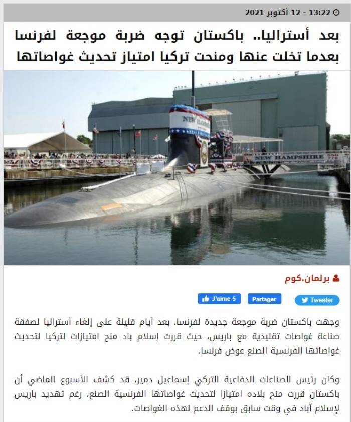 Arap basını, Pakistan'ın Fransız yapımı denizaltıların modernizasyonu için Türkiye ile anlaşmasının AUKUS sonrası Fransa'ya vurulan ikinci bir darbe olduğunu yazdı.