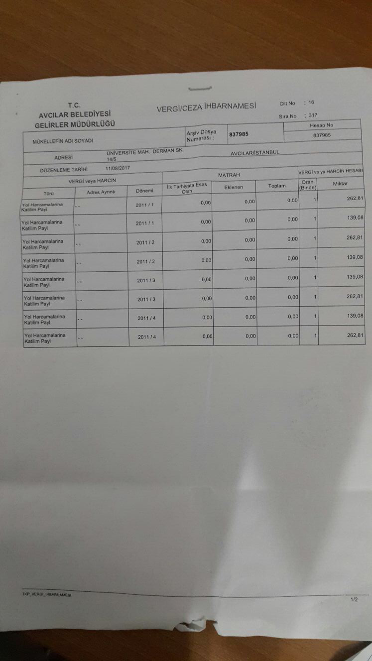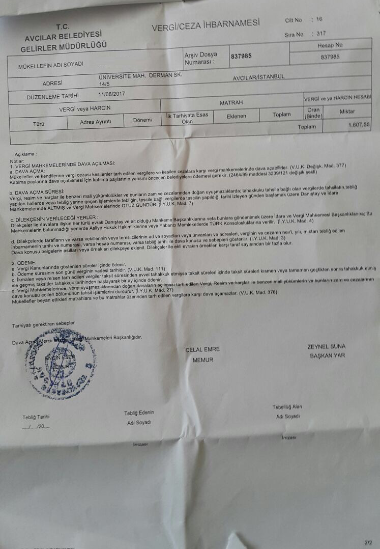 Konuya ilişkin açıklama yapan Ethem Balcı adlı vatandaş, Avcılar Belediye Başkanlığı Gelirler Müdürlüğü tarafından kendisine gönderilen 21 Ağustos 2017 tarihli bir ihbarname olduğunu ve dairesi için kaldırım parası istendiğini söyledi. Gönderilen ihbarnamede borcun ‘Yol Harcamalarına Katılma Payı’ olarak belirtildiğini ve 2011 yılına ait olduğu bilgisini veren Balcı, “8 ayrı kalemde kesilen bu borçlar benden gecikme faiziyle birlikte tahsil edilmek isteniyor. Ana borç 1.753 TL iken bu miktar faiziyle birlikte 3.052.44 TL’ye çıkmış” ifadelerini kullandı.