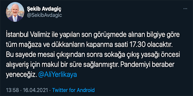 Avdagiç, bir önceki paylaşımında ise "İstanbul Valimiz ile yaptığımız görüşmeler sonunda Valiliğimizin talepleri doğrultusunda; AVM ile cadde mağazalarının kapanma saati 17.00, semt dükkanlarının kapanma saati 17.30 olarak belirlenmiştir. Bu zor dönemde vakaları azaltmak için fedakarlık gerekiyor" açıklamasında bulunmuştu.