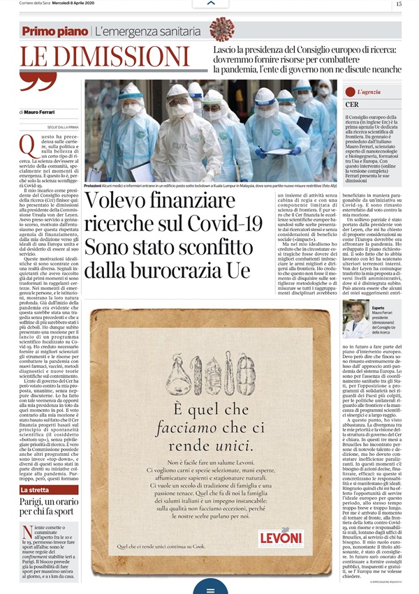 Avrupa Araştırma Konseyi(ERC) Başkanı Prof. Mauro Ferrari, ilk olarak Çin'de ortaya çıkan ve tüm dünyaya ölüm saçan koronavirüs salgınına ilişkin tedavi, ilaç, aşı araştırmalarına yönelik finansman önerisi reddedilince istifasını sundu.