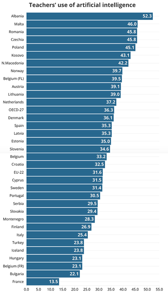 32 ülke arasında, ortaokul düzeyindeki öğretmenler arasında AI kullananların oranı 2024 itibarıyla Fransa’da yüzde 14’ten Arnavutluk’ta yüzde 52’ye kadar değişiyor. Avrupa Birliği’nde (AB-22) ortalama yüzde 32, OECD’de (27 ülke) ise yüzde 36.