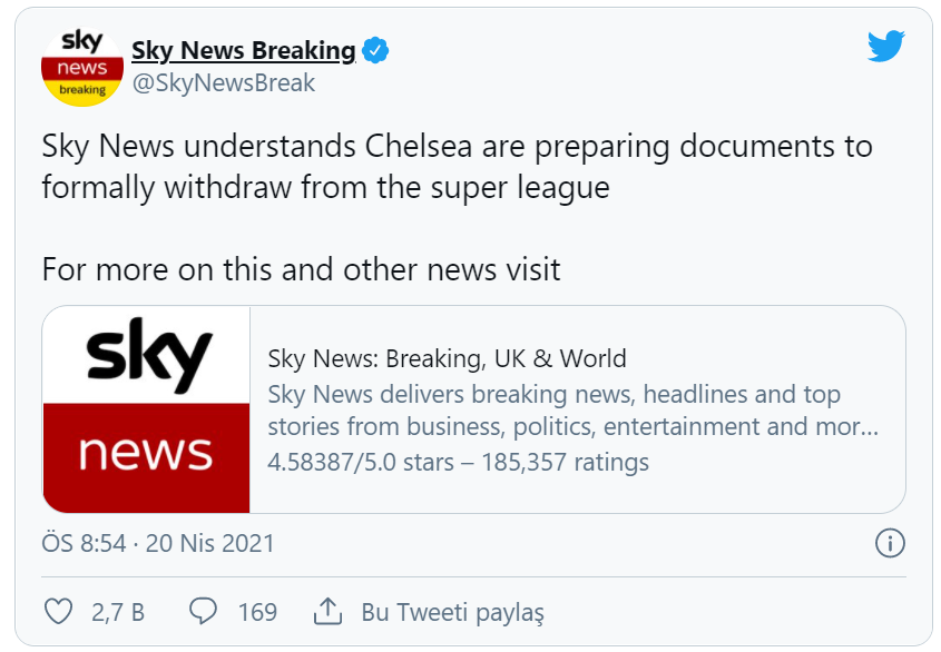 İngiliz Sky News kanalın haberinde, Avrupa Süper Ligi'nin kurucu 12 üyesinden biri olan Chelsea futbol takımının ligden çekilmek için belgeleri hazırlamaya başladığı iddia edildi.