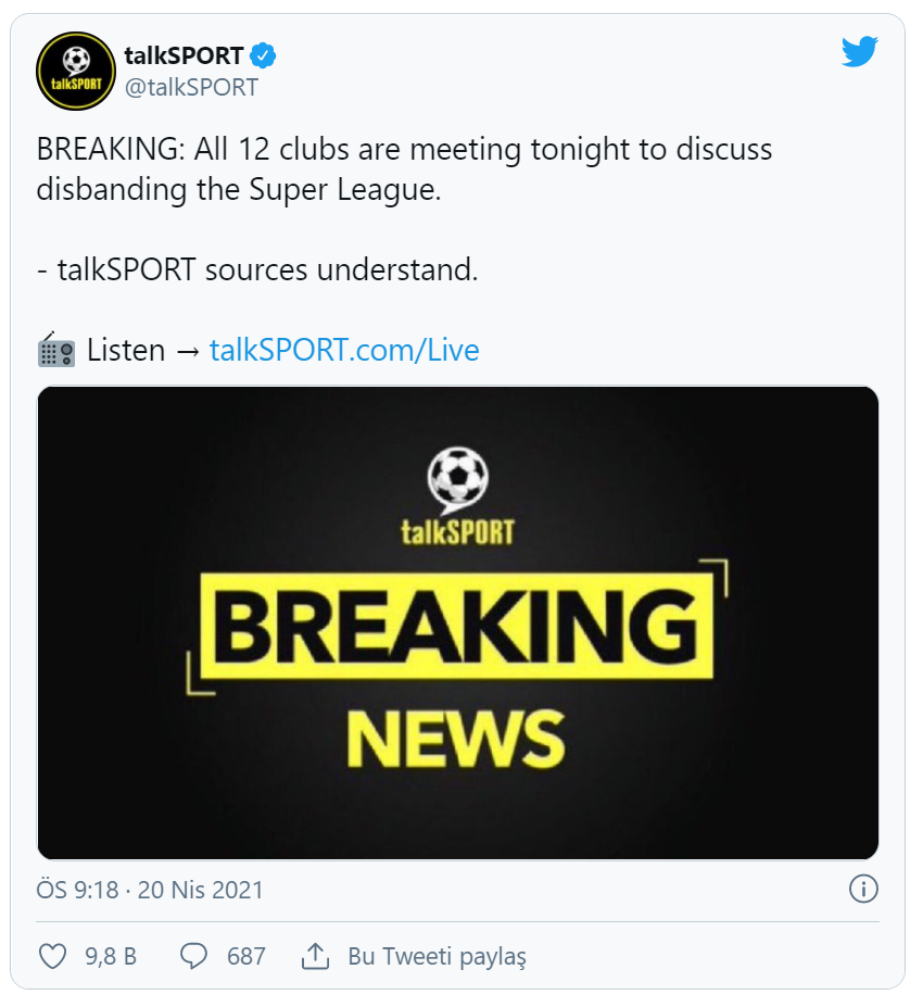 talkSPORT'un iddiasına göre, Avrupa Süper Ligi'nin kurucusu olan 12 futbol takımının bu gece ligi dağıtma konusunu ele almak üzere toplanması bekleniyor.
