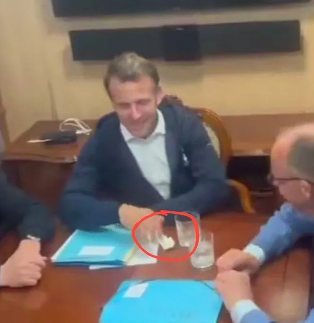 Görüntüde, Macron'un masa üzerindeki beyaz renkteki maddeyi eliyle sakladığı görülüyor.