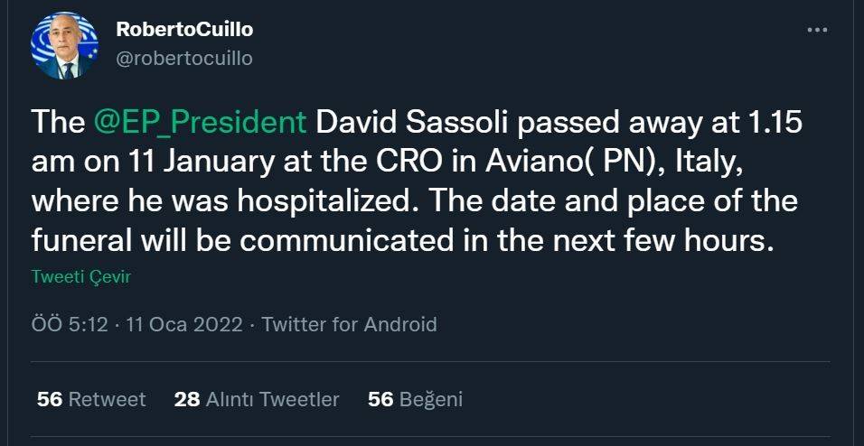 Sassoli'nin Sözcüsü Roberto Cuillo, Twitter'dan yaptığı açıklamada, "Avrupa Parlamentosu Başkanı David Sassoli, 11 Ocak günü sabah saat 1.15'te İtalya'nın Aviano kentinde kaldırıldığı hastanede hayatını kaybetti" dedi.