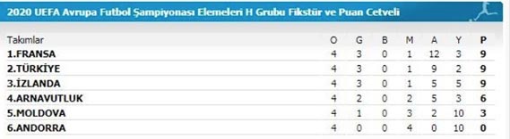 EURO 2020 Avrupa elemeleri, EURO 2020 Avrupa şampiyonası, EURO 2020 Avrupa futbol şampiyonası elemeleri, EURO 2020 Avrupa şampiyonası puan durumu ne? EURO 2020 elemelerinde Türkiye, Fransa karşısında galip gelirken, Dün oynanan İzlanda maçında 2-1 mağlup ayrıldı. EURO 2020 puan durumu Avrupa Futbol Şampiyonası Elemeleri H Grubu'nda Türkiye kaçıncı sırada? İşte EURO 2020 Avrupa elemeleri grupları maç sonuçları ve son puan durum.