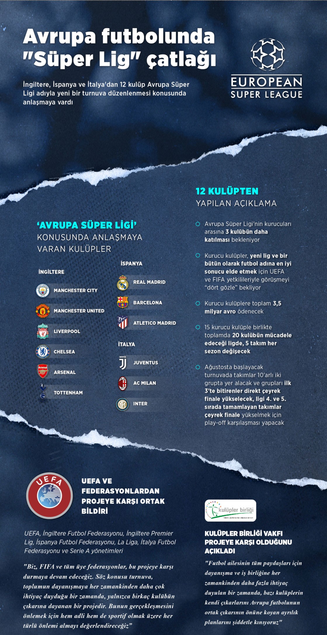 Avrupa Süper Ligi son dakika haberleri yakından takip ediliyor. Dünyanın en güçlü kulüpleri arasında yer alan Real Madrid, Barcelona, Atletico Madrid, Liverpool, Manchester City, Manchester United, Arsenal, Chelsea, Tottenham Hotspur, Juventus, Inter ve Milan kulüplerinden yapılan ortak açıklamayla Avrupa Süper Ligi'nin kurulması teklifi edildi. Peki Avrupa Süper Ligi'ne Galatasaray katılacak mı?