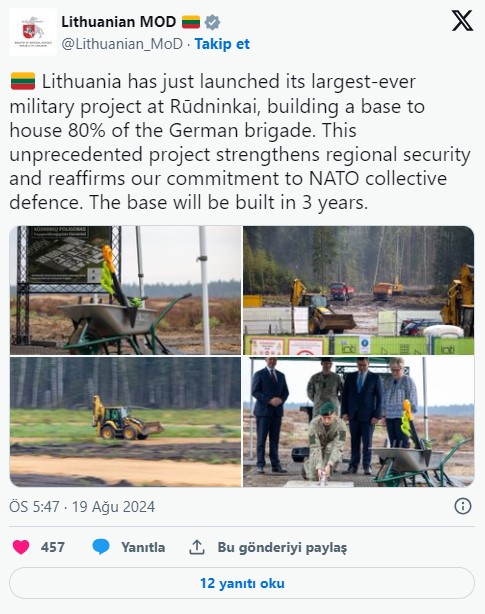 Litvanya ise bu askerlerin üçte birinin aileleriyle birlikte geleceğini tahmin ediyor. Litvanya Savunma Bakanlığı’na göre, tugayın konuşlandırılmasıyla ilgili askeri ve eğitim yatırımlarının 800 milyon euro’ya ulaşabileceği belirtiliyor. Konuyla ilgili açıklamalarda bulunan Litvanya Savunma Bakanı Laurynas Kasčiūnas ise şu ifadelere yer verdi: