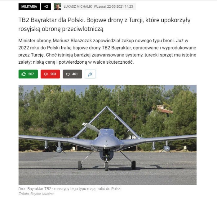 Polonya Savunma Bakanı Blaszczak’ın "İyi haberler yakında geliyor" notuyla Bayraktar TB2 SİHA fotoğrafını paylaşması akabinde de Türkiye’den 24 adet SİHA alacaklarını söylemesi sonrası Türk İHA-SİHA’ları ülke medyasından kendine sıkça yer bulmaya başladı.