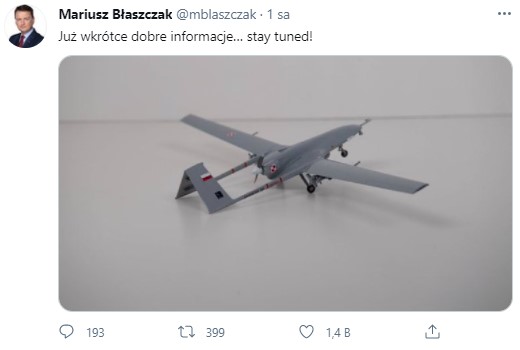 Polonya Savunma Bakanı Mariusz Błaszczak, "İyi haberler yakında geliyor ... bizi izlemeye devam edin" diyerek BAYRAKTAR TB2'nin fotoğrafını paylaştı.