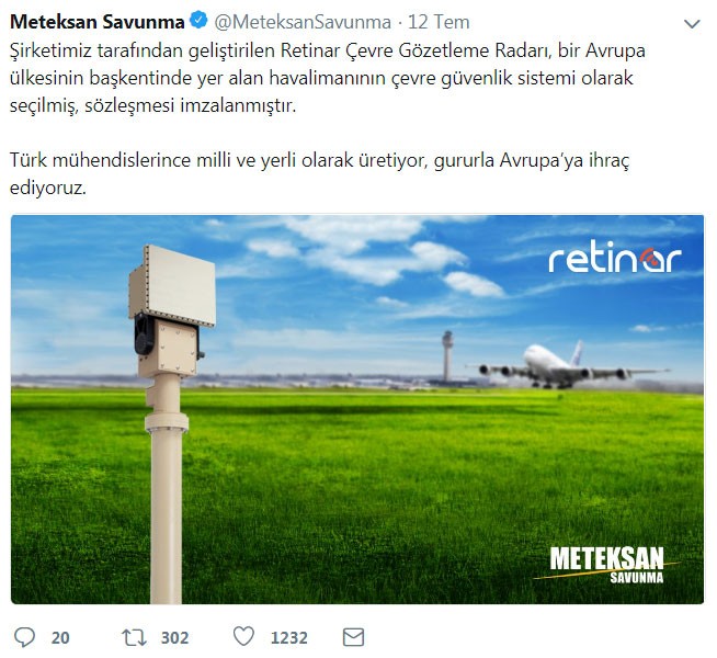 Resmi Twitter hesabı üzerinden açıklama yapan Meteksan Savunma, yerli ve milli olarak geliştirdikleri Retinar Çevre Gözetleme Radarı'nın bir Avrupa ülkesinin başkentinde yer alan havalimanına kuracaklarını ve anlaşmanın imzalandığını duyurdu.
