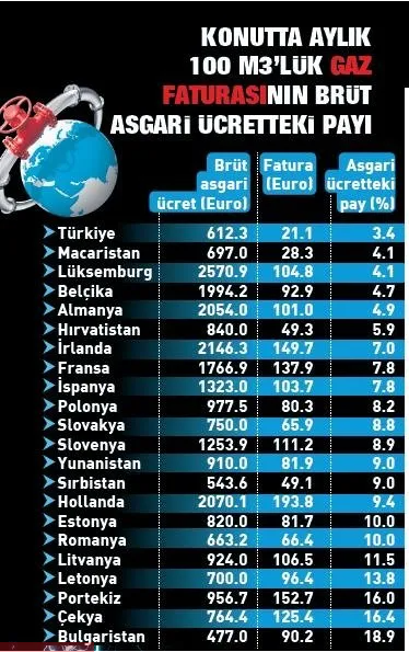 Konutlardaki doğalgaz tüketiminin asgari ücret içindeki düşüklüğünde ise Türkiye, Avrupa birincisi oldu. Türkiye'de doğalgaz faturasının payı asgari ücret içerisinde yüzde 3.4 iken, Türkiye'yi görece ucuzlukta Macaristan, Lüksemburg, Belçika, Hırvatistan ve Fransa gibi ülkeler takip etti.
