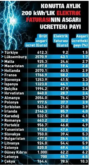 TÜRKİYE elektrik tüketim bedelinin net asgari ücret içindeki payında da en düşük faturaya sahip lider ülke konumunda. 2024 Şubat itibarıyla 200 kilowatsaat elektrik tüketiminin net asgari ücret içerisindeki payı yüzde 1.5 olarak gerçekleşti. 2002'de 164.6 lira olan asgari ücretin 33.1 lirası yani yüzde 20.1'i elektrik faturalarına ödeniyordu. Konutlarda elektrik tüketimi asgari ücret payında lider olan Türkiye'yi sırasıyla Lüksemburg, Malta, Macaristan ve Hollanda gibi ülkeler izliyor.